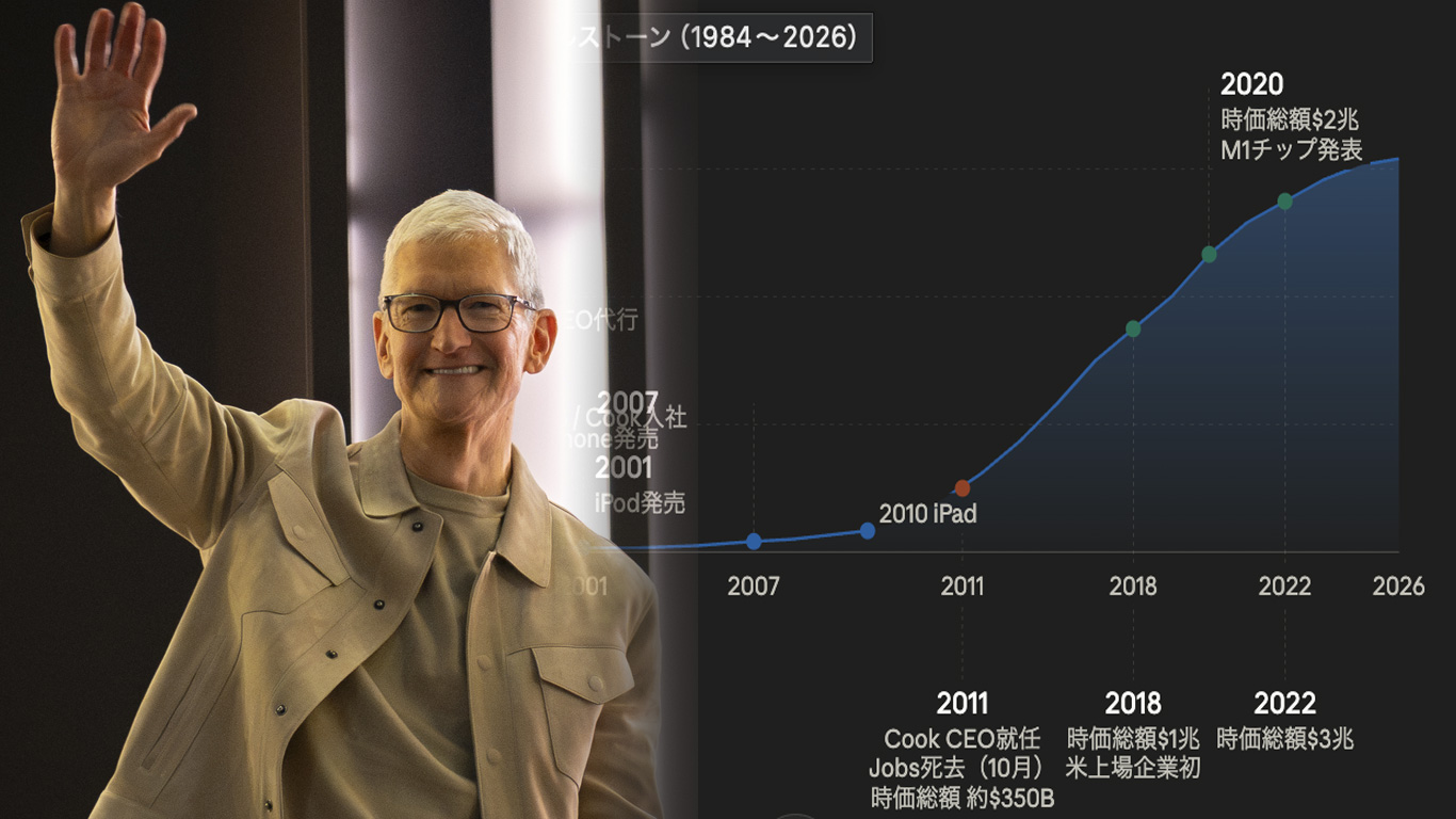 Jobs解任(1985)、復帰(1997)、iMac G3とCook氏入社(1998)、iPod(2001)、iPhone(2007)、iPad(2010)、Cook氏CEO就任(2011)、時価総額$1兆(2018)、$2兆(2020)、$3兆(2022)、そして$4兆到達(2025)と、大きなカーブのほとんどはCook体制下で描かれました。Jobsが遺した設計を、Cook氏が世界規模の事業に翻訳した15年、という表現が数字にも表れています。